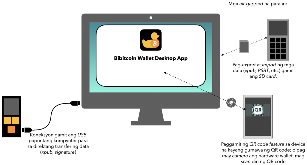 - Kung air-gapped (iniiwasan ang koneksyon ng wire), pwedeng mag-import ng xpub file mula sa SD card ng isang hardware wallet, o kaya mag scan ng QR code. Depende ito sa kakayahan ng hardware wallet.