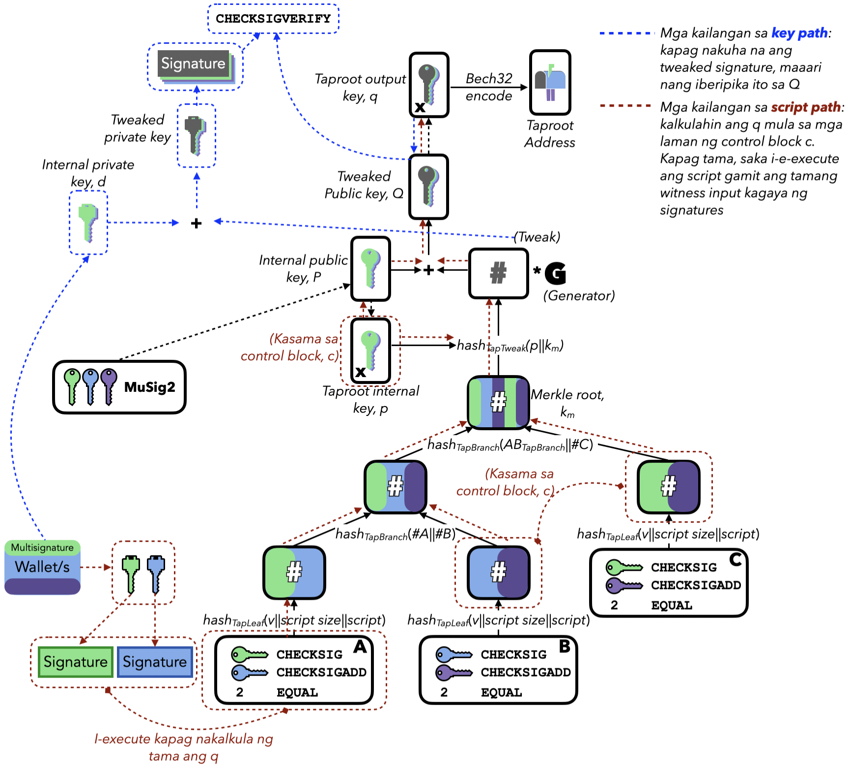 - Direktang magasta sa pamamagitan ng pagbibigay ng signature na mabeberipika gamit ang Q. Ito ang key path. Ang signature na tinutukoy ay ang gagawin ng tweaked private key. Ano ito? Ito ang private key, d, na tugma sa P, pero dadagdagan ng parehas na tweak: d + hashTapTweak(p||km)G.