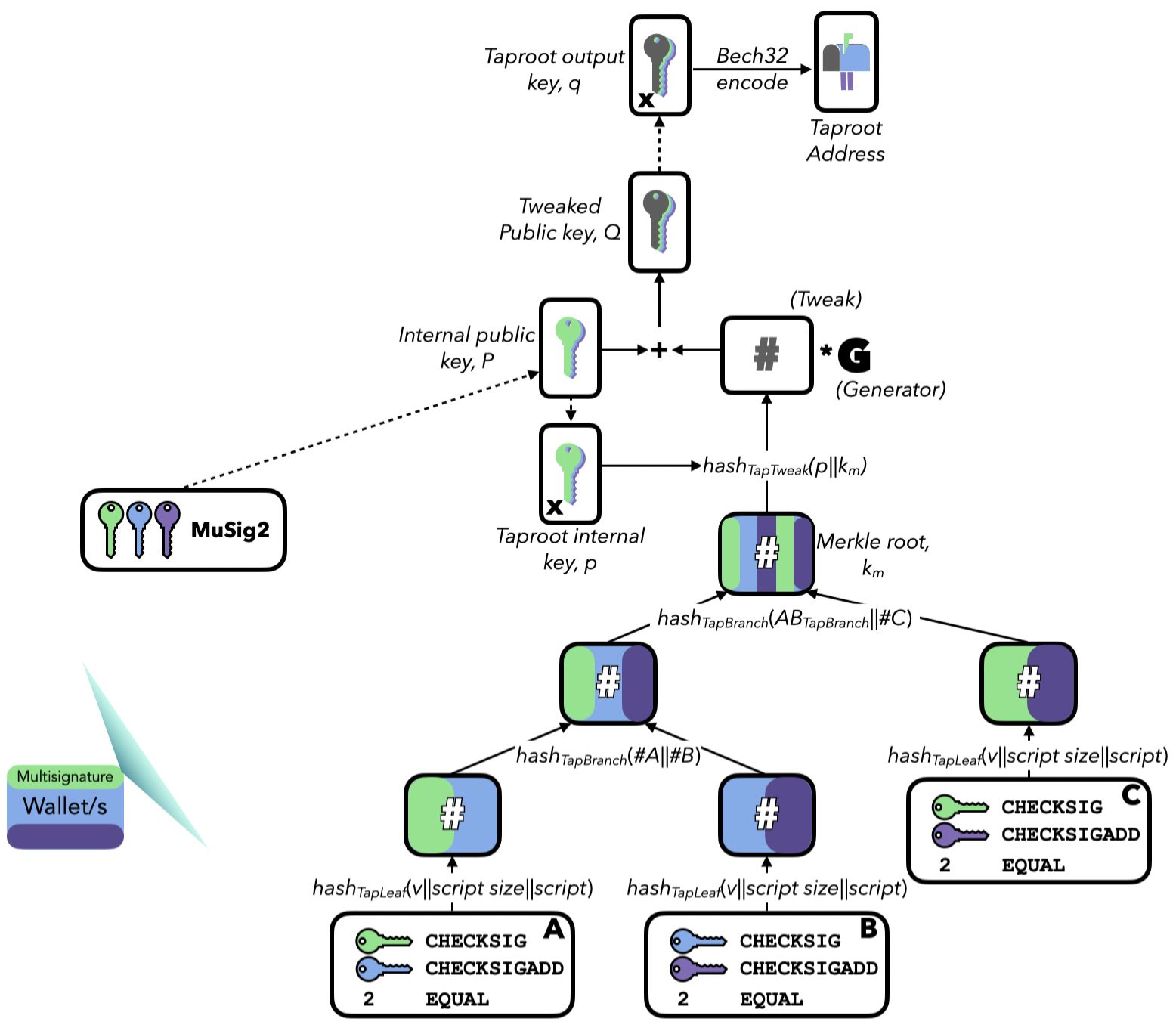 Ang mga iba-ibang scripts ay gagawan ng Merkle Tree, kung saan ang bawat script ay mapapaloob sa tapleaf. Sa ganitong paraan, magkakaroon ng kondisyon na parang OR – bawat script sa isang leaf ay magiging alternatibong paraan ng paggasta ng UTXO. Tignan natin ang ilustrasyon ng Merkle Tree at relasyon nito sa n-of-n na aggregated key: